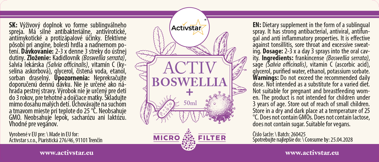 ACTIV BOSWELLIA è un estratto di resina di alta qualità ricavato dalla resina dell'albero di palmetto (Boswellia serrata) in una pratica forma spray. Questo prodotto naturale è noto per i suoi potenti effetti antinfiammatori, antibatterici e rigenerativi.