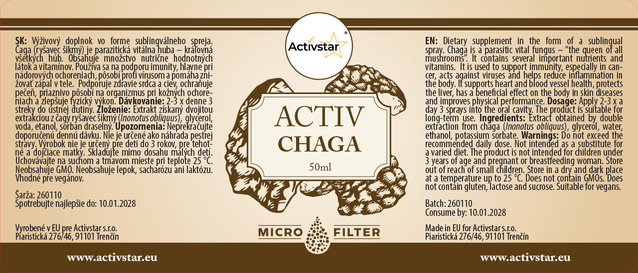 Estratto ottenuto per doppia estrazione da Chaga obliqua (Inonotus obliquus), glicerolo, acqua, etanolo, sorbato di potassio.