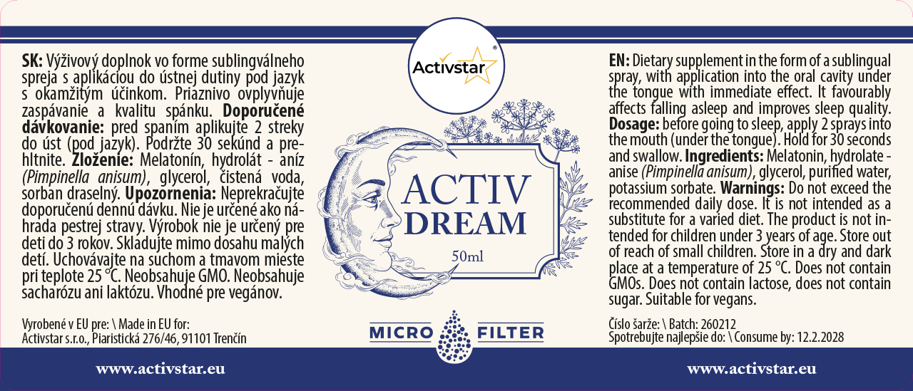 Activ Dream è un integratore alimentare in forma di spray sublinguale studiato per favorire l'addormentamento e la qualità del sonno. La comoda applicazione sotto la lingua garantisce un uso confortevole prima di andare a letto, senza bisogno di deglutire.