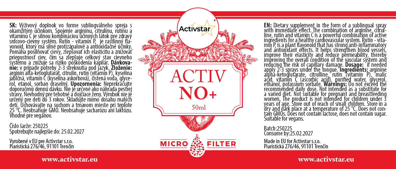 ACTIV NO+ è un integratore alimentare sotto forma di spray sublinguale ad effetto immediato. La combinazione di arginina, citrullina, rutina e vitamina C è una combinazione estremamente potente di principi attivi che favoriscono la salute dei vasi sanguigni, la microcircolazione e la forma generale del sistema cardiovascolare.