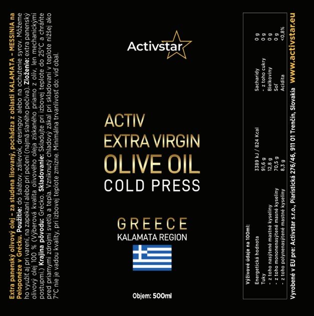 Scoprite l'Olio Extravergine di Oliva Activstar della regione di Kalamata - 100% naturale, spremuto a freddo, senza chimica. Gusto ricco e fruttato, pieno di antiossidanti e grassi sani. Ottimo per insalate, cucina e forno.