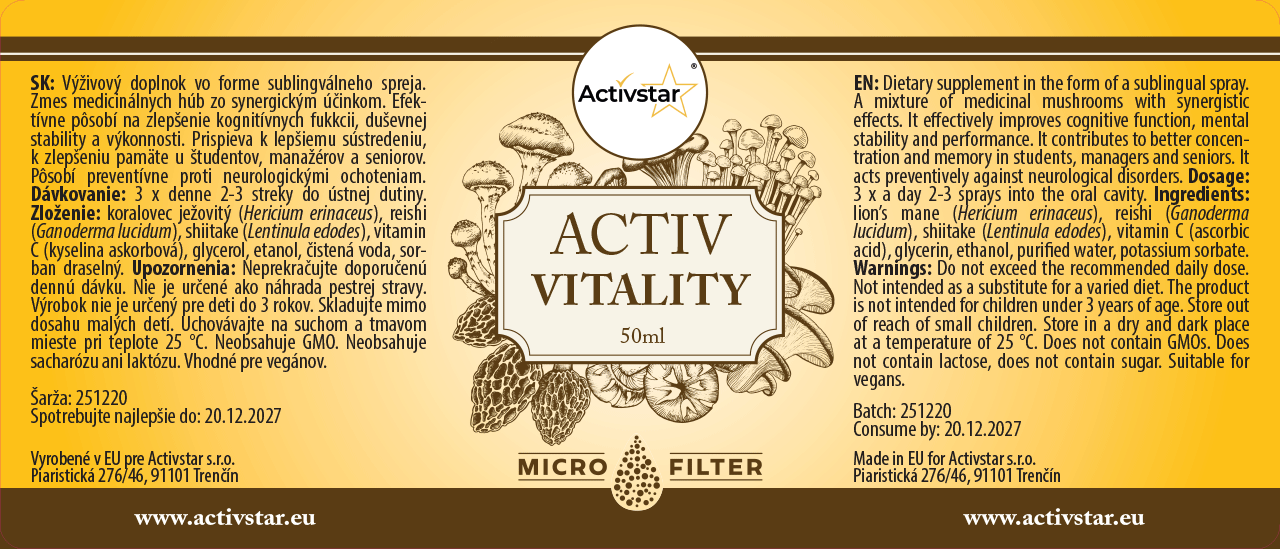 ACTIV VITALITY è un integratore alimentare in forma di spray sublinguale che combina il potere dei funghi medicinali con un effetto sinergico. Supporta le funzioni cognitive, la concentrazione, la memoria e le prestazioni mentali. È ideale per studenti, dirigenti, anziani e tutti coloro che desiderano aumentare la vitalità e la resistenza mentale.