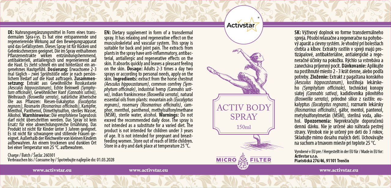 ACTIVBODY SPRAY è un integratore alimentare innovativo sotto forma di spray transdermico. È pensato per tutti coloro che cercano un aiuto efficace e rapido per prendersi cura del proprio corpo e hanno bisogno di sostenere il recupero dopo una giornata intensa o una prestazione sportiva.